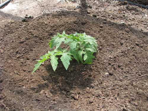Once the tomato is in the hole, we double check the depth by judging how far out of the ground the plant will be sticking.