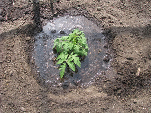 We also recommend putting a handful of pure worm castings in the bottom of the hole. We amend our beds with worm castings and we also spray a worm casting tea on the plants while they grow. Really great stuff. Worm castings are available for sale at our tomato plant sale.