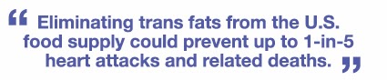 This type of fat is even more harmful to cardiovascular health than saturated fat. It increases levels of “bad” LDL cholesterol and lowers levels of “good” HDL cholesterol. Research from the Harvard School of Public Health Department of Nutrition estimates that eliminating trans fats from the U.S. food supply could prevent up to 1-in-5 heart attacks and related deaths.